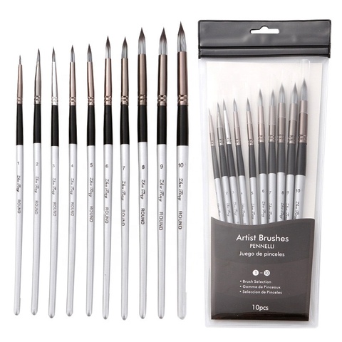 Juego de pinceles finos para pintura de artista en miniatura, 10 Uds., con pelo de nailon negro para pintura de acuarela, mango de plástico